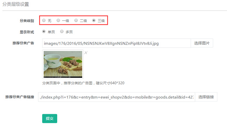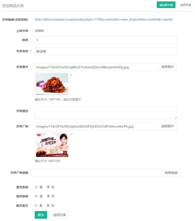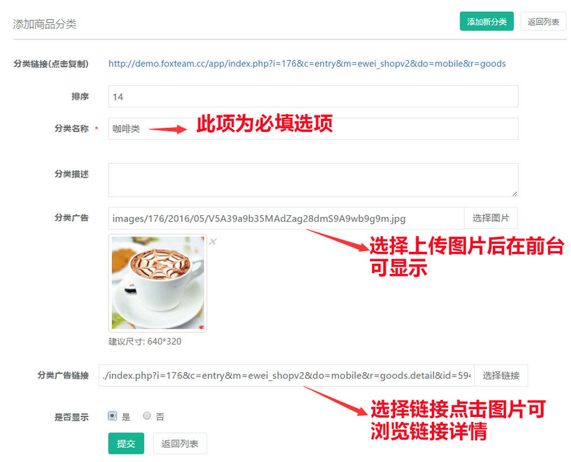 填寫分類名稱,上傳圖片及鏈接等信息,參見下圖: