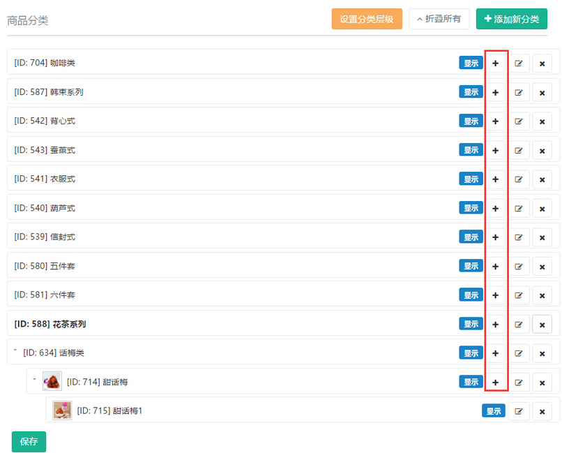 添加后的商品鏈接在“商品分類”列表中列示,分類的順序是按照添加分類時填寫的“排序”,數(shù)字越大信息越靠前顯示,如商品分類有子分類的話(系統(tǒng)支持最多添加3級分類),可點(diǎn)擊已添加分類后的“+”進(jìn)行添加,參見下圖: